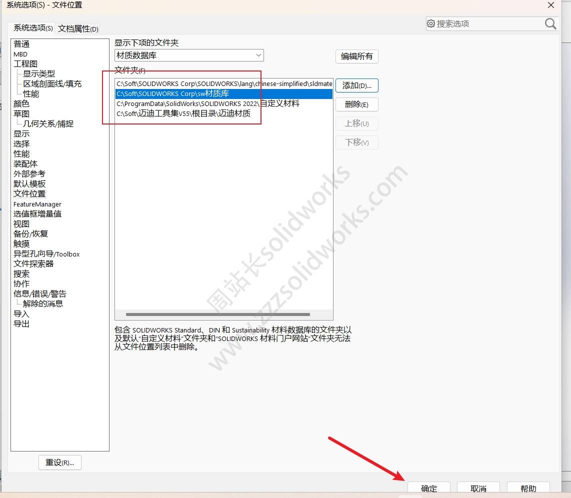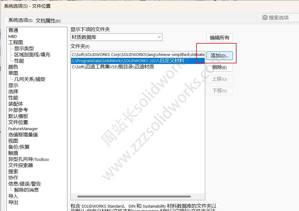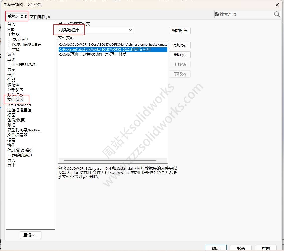 点击系统选项,文件位置,把显示下项的文件夹改成材质数据库;