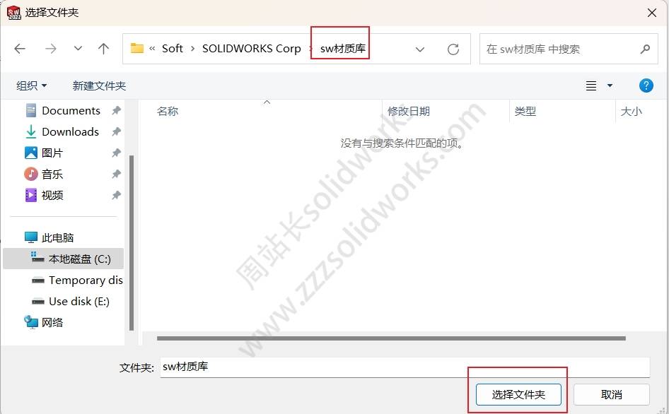 找到前面解压后的sw材质库文件夹,点击选择文件夹;