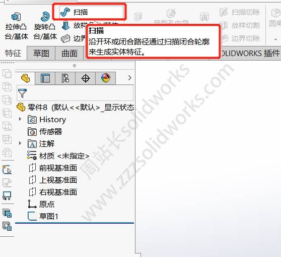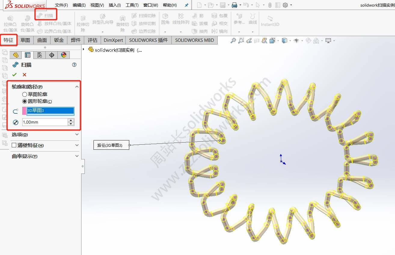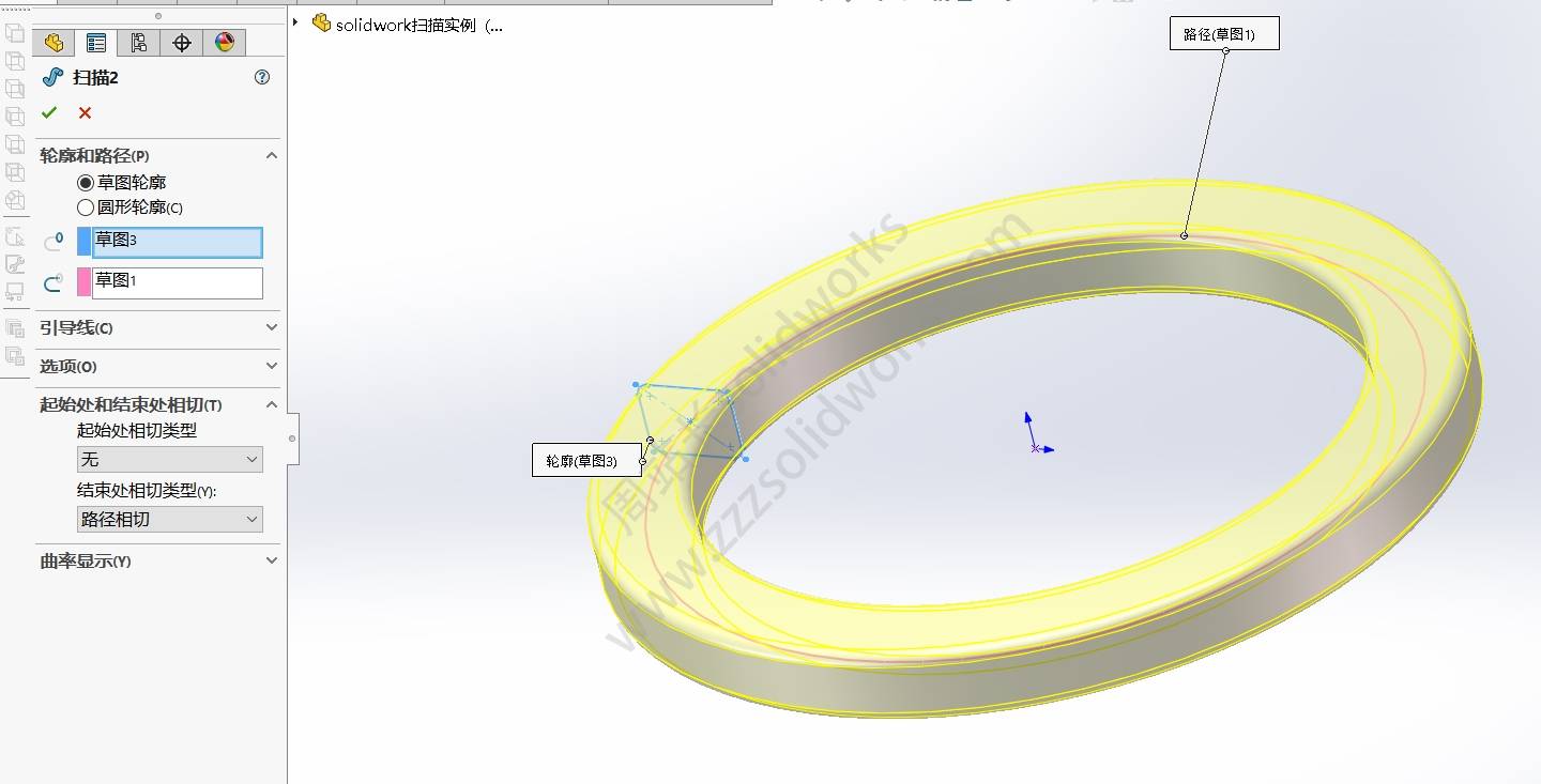 然后开始绘制磁环。这里要利用扫描特征。草图选择之前绘制的矩形草图(草图3),路径选择绘制的圆(草图1)。