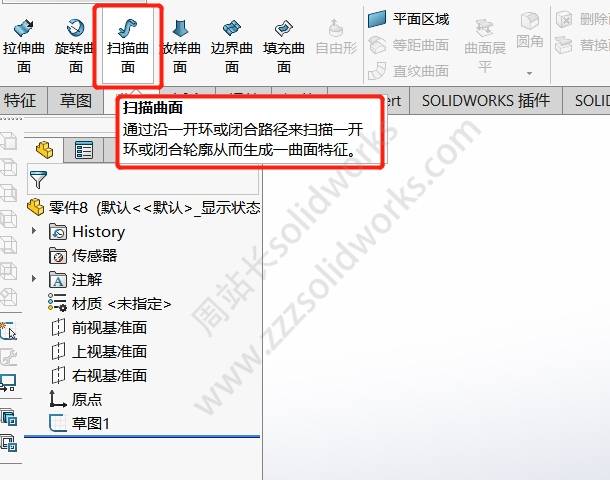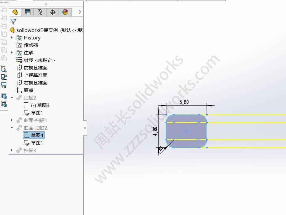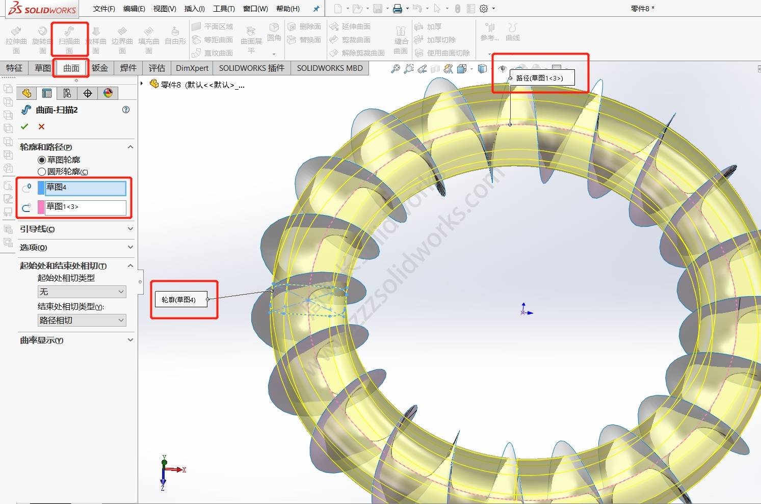 在制作交叉曲线之前,再次利用扫描曲面特征。草图选择绘制的矩形(草图4),路径选择圆(草图1),如下图: