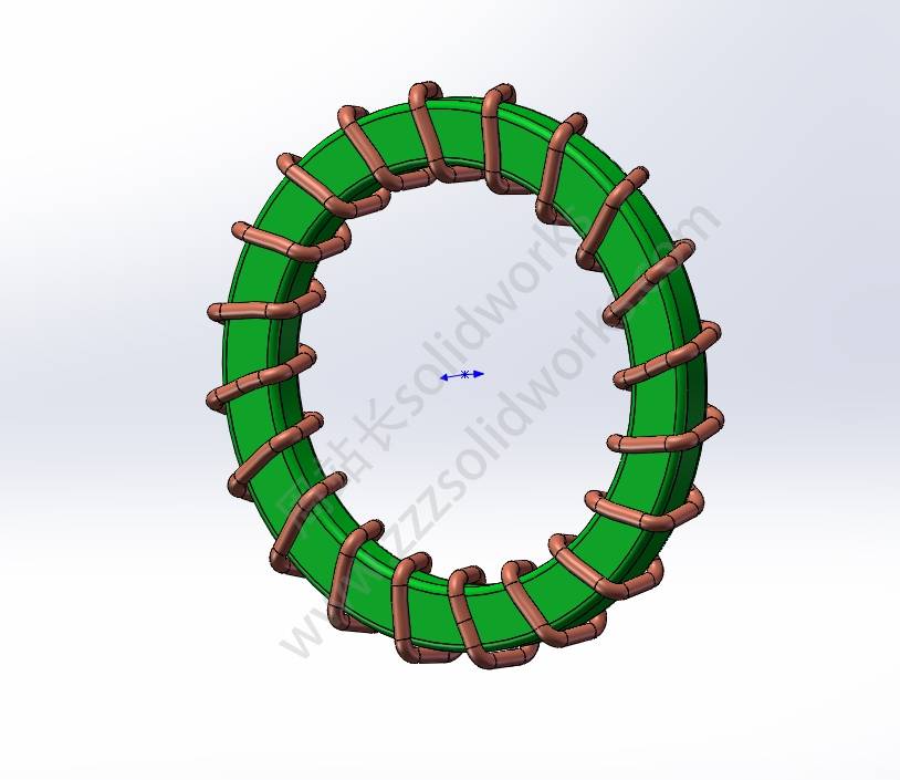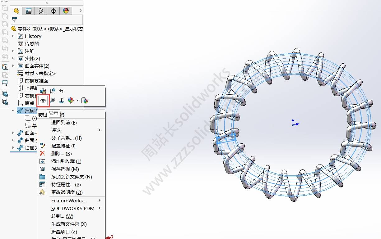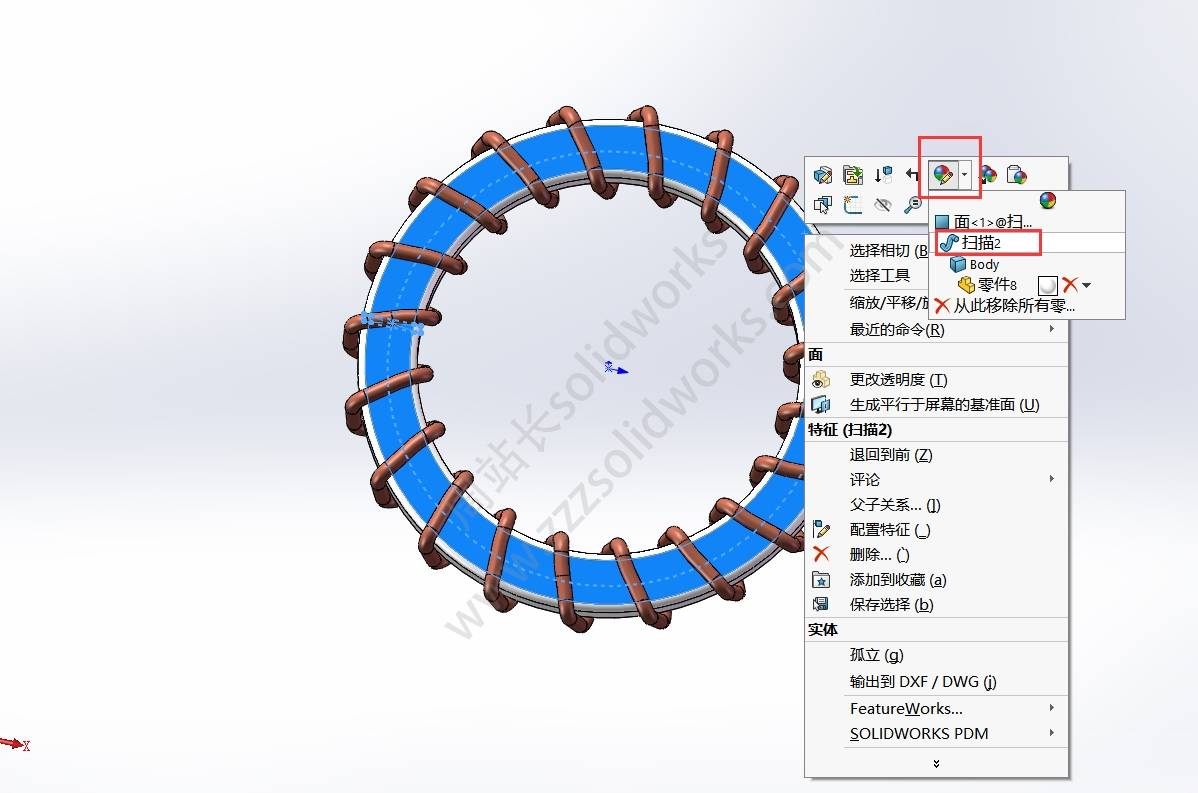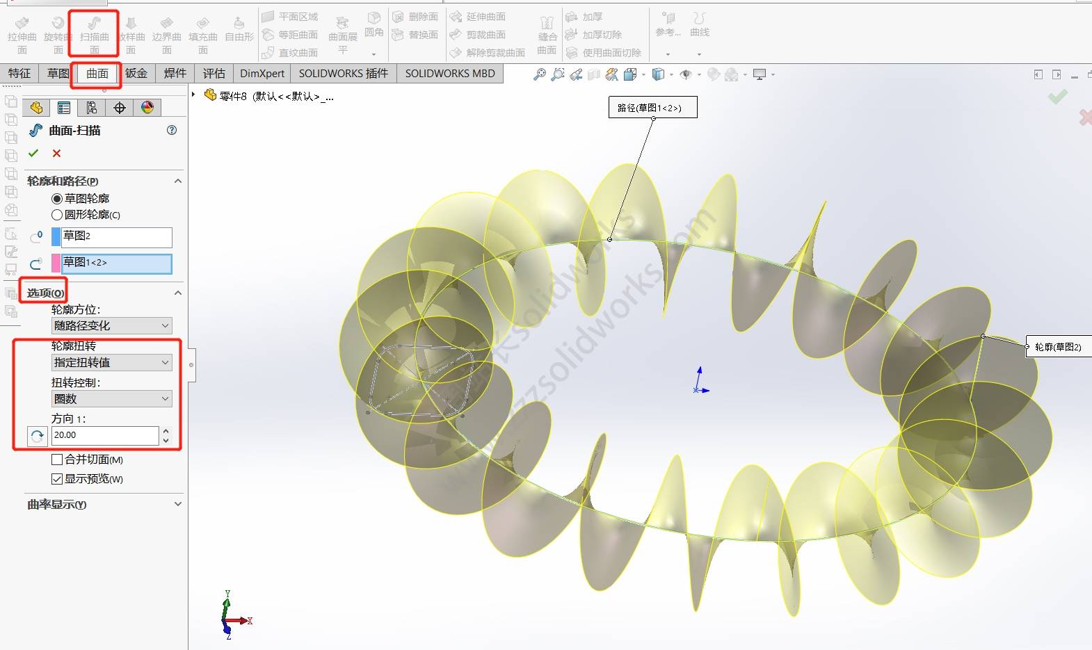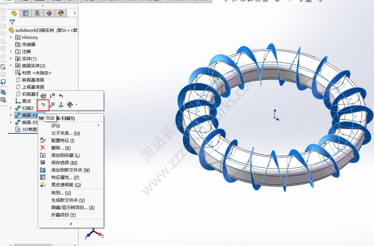 这时磁环画完了,最主要就是绘制缠绕在磁环上的线。这里就要用到扫描曲面特征,选择轮廓扭转选项使路径发生变化。把之前绘制的磁环隐藏掉,避免干扰视线。