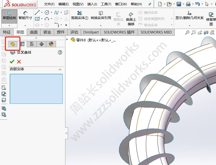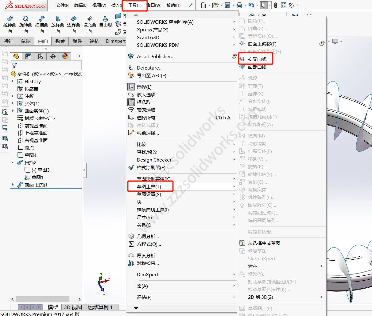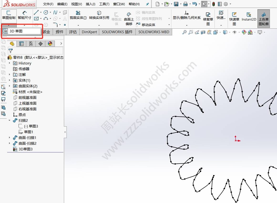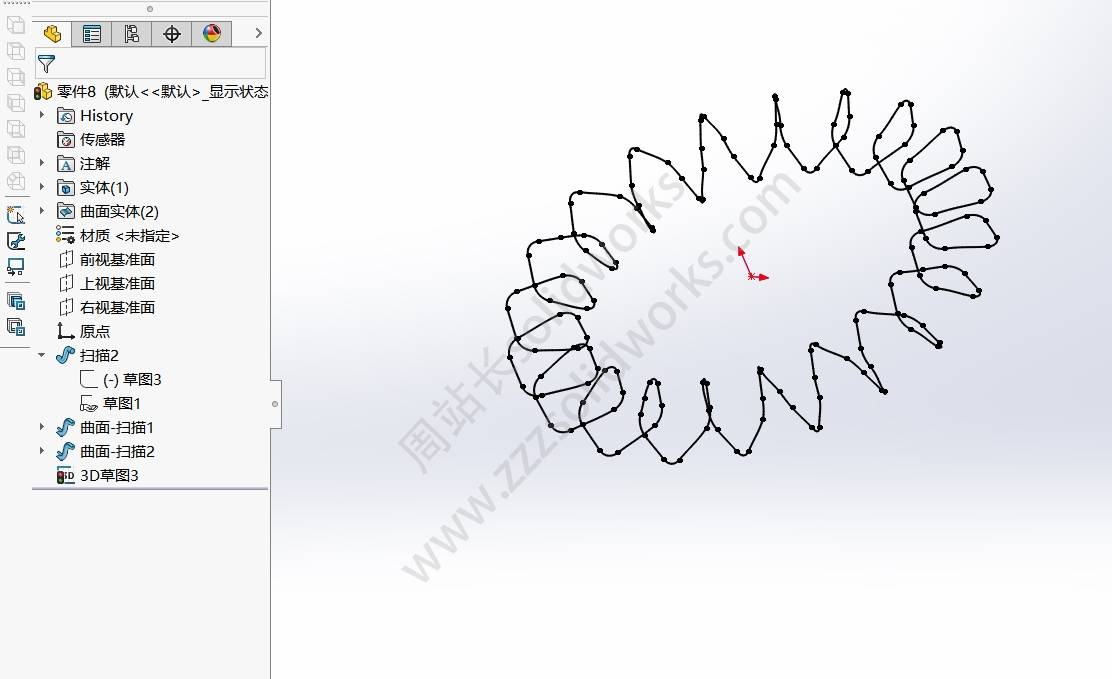 这时路径形状已经出来了,但是是曲面,我们就要想办法让他变成曲线。这里就要利用交叉曲线工具,绘制一个3D草图。