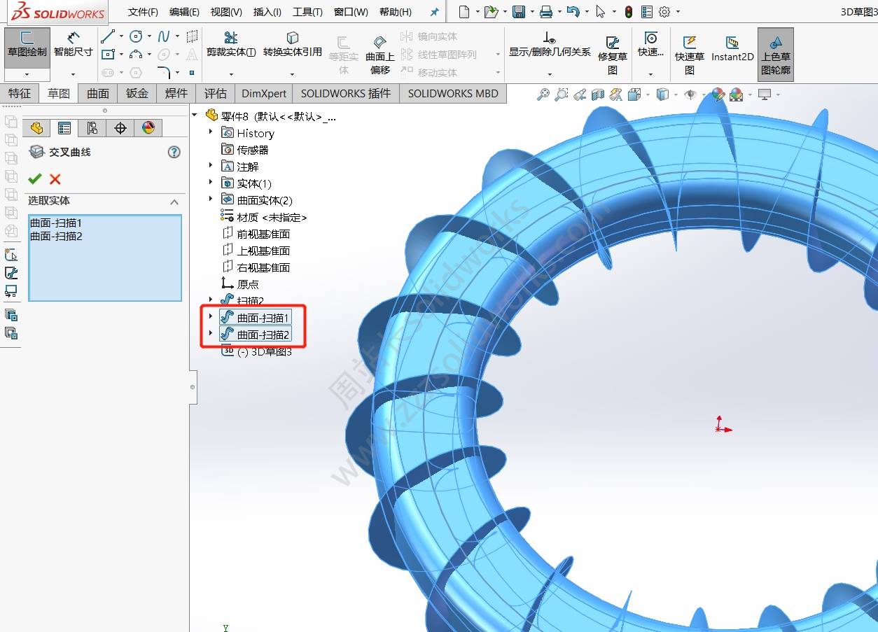 然后就是利用这两个扫描曲面制作交叉曲线。